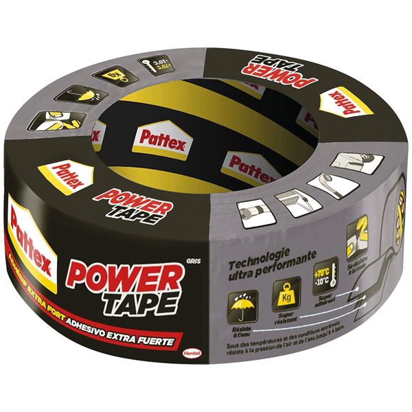 Pattex adhésif Power tape gris étui 50m x 50 mm de la marque PATTEX. !adhésif elastomere. Résiste à l'eau, aux intempérieset à la pression (max 4b).Se découpe facilement à la main.