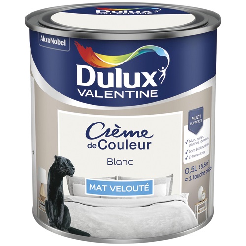 La peinture Crème de couleur de 0.5 L en coloris blanc finition mat de la marque DULUX VALENTINE est une peinture spécialement conçue pour vous permettre de réaliser facilement tous vos projets intérieurs. Grâce à son fort pouvoir couvrant, la peinture Crème de couleur ne coule pas et ne goutte pas lors de son application. Elle s'applique en une seule couche, sèche rapidement en 30 minutes. Son aspect mat donne un effet soyeux et de profondeur à votre intérieur. La gamme Crème de coleur vous offre une très large palette de teintes pour la décoration de vos murs et boiseries intérieurs (portes, plinthes et meubles).
