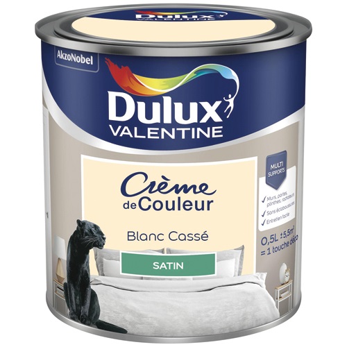 La peinture Crème de couleur de 0.5 L en coloris blanc cassé finition satin de la marque DULUX VALENTINE est une peinture spécialement conçue pour vous permettre de réaliser facilement tous vos projets intérieurs. Grâce à son fort pouvoir couvrant, la peinture Crème de couleur ne coule pas et ne goutte pas lors de son application. Elle s'applique en une seule couche, sèche rapidement en 30 minutes. Son aspect satiné donne un effet soyeux et de profondeur à votre intérieur. La gamme Crème de coleur vous offre une très large palette de teintes pour la décoration de vos murs et boiseries intérieurs (portes, plinthes et meubles).