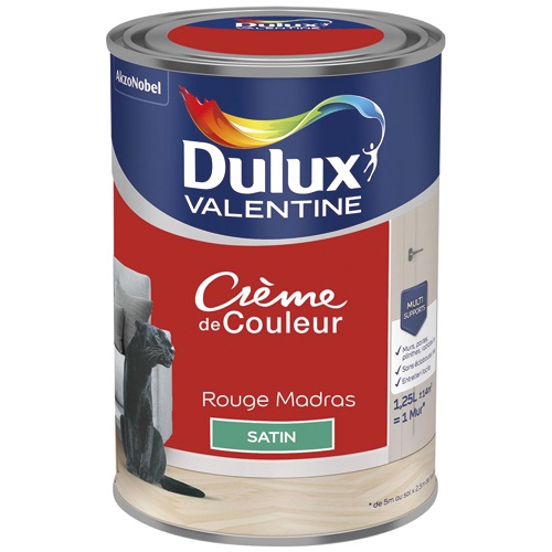 La peinture Crème de couleur de 1.25 L en coloris rouge madras finition satin de la marque DULUX VALENTINE est une peinture spécialement conçue pour vous permettre de réaliser facilement tous vos projets intérieurs. Grâce à son fort pouvoir couvrant, la peinture Crème de couleur ne coule pas et ne goutte pas lors de son application. Elle s'applique en une seule couche, sèche rapidement en 30 minutes. Son aspect satiné donne un effet soyeux et de profondeur à votre intérieur. La gamme Crème de coleur vous offre une très large palette de teintes pour la décoration de vos murs et boiseries intérieurs (portes, plinthes et meubles).