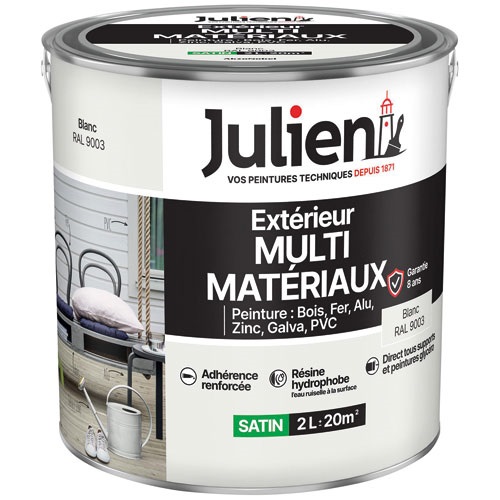 La peinture extérieur satin pour multi-matériaux de 2 L en coloris blanc RAL9003 est idéale pour protéger durablement et décorer tous vos supports en bois, fer, alu, zinc, galva et PVC. Sa formule offre une haute opacité sur les supports. résiste aux intempéries et aux UV pour des couleurs durables dans le temps. Elle s'applique directement, sans sous-couche, sur tous les supports et peintures glycéro et sèche au toucher en 1h et en 6h entre 2 couches. Rendement 20 m². Adhérence renforcée. Résine hydrophobe. Garantie 8 ans.