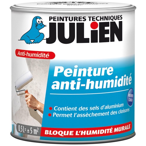 La peinture anti-humidité pour murs intérieurs blanc de 0,5 L de la marque JULIEN est spécialement conçue pour un usage en intérieur. Cette peinture anti-humidité ultra-résistante prévient et isole de l'humidité murale. Le salpêtre, les moississures, les auréoles de paiers peints, l'effritement de la peinture sont empêchés grâce à sa formule riche en sels d'aluminium et bactéricides. Cette peinture agit comme une barrière contre l'humidité et s'applique sur plusieurs types de supports même légèrement humides : ciment, brique, béton, plâtre, etc. Elle assèche progressivement les supports humides. Conseils d'utilisation : S'assurer que la surface à traiter est saine et propre. Brosser et dépoussiérer les supports neufs. Nettoyer et décaper si nécessaire les supports anciens. Éliminer toutes traces éventuelles de salpêtre ou de moisissures à la ponçeuse puis rincer le support à l'eau de Javel. Ne pas diluer la peinture. Appliquer généreusement la peinture à l'aide d'une brosse ou d'un rouleau. Appliquer idéalement 2 couches. Ne pas laisser à la portée des enfants. Rendement : 0.5 L = environ 5 m². Application : brosse ou rouleau. Temps de séchage : sec au toucher après 12 h. Temps de séchage entre 2 couches : 24 h. Temps de séchage avant pose de papier peint : 48 h.