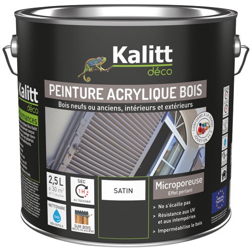 La peinture bois microporeuse satin Extérieur de 2.5 L en coloris blanc de la marque Kalitt Déco est une peinture acrylique PU à base d’eau pour l’intérieur et l’extérieur. Laque acrylique pour des revêtements décoratifs et protecteurs à l’intérieur et à l’extérieur. Est excellent pour le revêtement de bois et de métal apprêté, des plastiques pouvant être peints (par exemple le PVC dur), ainsi que pour les revêtements de rénovation sur tous les anciens revêtements porteurs. Le revêtement séché est conforme à la norme DIN EN 71.3. La composition de la peinture lui confère une haute protection contre les intempéries, l'application est aisée, est renforcé au PU : extrêmement durable, résistant aux chocs et aux impacts, séchage rapide, projetable avec un équipement de projection approprié, résiste à des températures allant jusqu’à 80 °C environ, ne jaunit pas, est à base d’eau.