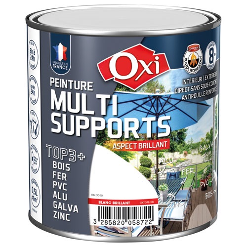 La peinture brillante multi-support TOP3 de 500 mL en coloris blanc RAL9010 de la marque Oxi est destinée à la décoration et la protection de nombreux matériaux bois, fer, PVC, métaux non ferreux, intérieurs et extérieurs. TOP3+ est une formule solvantée composée de résines de qualité supérieure et renforcée grâce à la « RUSTOL Technology ». Sur BOIS, TOP3+ est microporeux et protège de l'humidité, il s'oppose, sans cloquer, au vieillissement et à la dégradation des bois neufs ou anciens : volets, menuiseries, portails, bardages… Sur fer, TOP3+ est anticorrosion, il pénètre le métal rouillé pour en chasser l’humidité, il donne une résistance exceptionnelle contre la corrosion : portails, ferronneries, tuyauteries, bardages, chaudronnerie… Pour de multiples supports, TOP3+ s’oppose à la dégradation des matériaux, permet leur rénovation et leur décoration. Ses qualités d’accrochage permettent une application sur presque tous les supports : PVC, plastiques, galva, zinc, ciment, briques, enduits… Technique mais polyvalente, la formule de TOP3+ est issue d’une formulation professionnelle éprouvée depuis plus de 20 ans dans des conditions très difficiles, sa formulation de qualité est renforcée grâce à « RUSTOL Technology » qui permet une adhérence, une pénétration et une isolation exceptionnelle de tous les supports. S’applique sur supports sains, propres, secs et dégraissés, la plupart du temps sans sous-couche. Supprimer les particules friables par grattage, ponçage ou brossage. Cette peinture s'applique généralement en 1 couche en rénovation. Pour une protection optimale, les supports non peints pourront recevoir 2 couches fines. Appliquez chaque couche de façon régulière et en croisant les passes. Outils : pinceau, rouleau laqueur ou pistolet professionnel. Sec au toucher de 8 à 12 heures, 2ème couche après 24 heures minimum. Nettoyage des outils avec le diluant Universel CR10 ou White-Spirit.