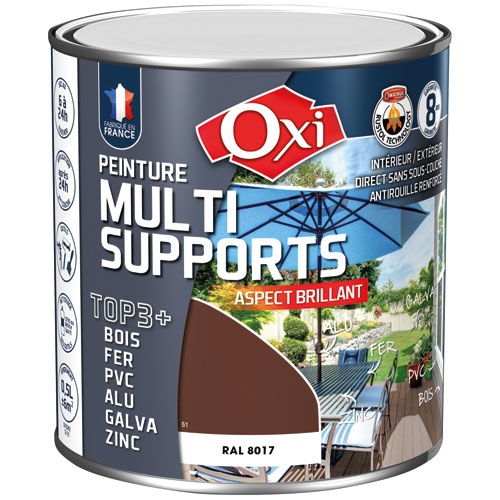 La peinture brillante multi-support TOP3 de 500 mL en coloris brun RAL8017 de la marque Oxi est destinée à la décoration et la protection de nombreux matériaux bois, fer, PVC, métaux non ferreux, intérieurs et extérieurs. TOP3+ est une formule solvantée composée de résines de qualité supérieure et renforcée grâce à la « RUSTOL Technology ». Sur BOIS, TOP3+ est microporeux et protège de l'humidité, il s'oppose, sans cloquer, au vieillissement et à la dégradation des bois neufs ou anciens : volets, menuiseries, portails, bardages… Sur fer, TOP3+ est anticorrosion, il pénètre le métal rouillé pour en chasser l’humidité, il donne une résistance exceptionnelle contre la corrosion : portails, ferronneries, tuyauteries, bardages, chaudronnerie… Pour de multiples supports, TOP3+ s’oppose à la dégradation des matériaux, permet leur rénovation et leur décoration. Ses qualités d’accrochage permettent une application sur presque tous les supports : PVC, plastiques, galva, zinc, ciment, briques, enduits… Technique mais polyvalente, la formule de TOP3+ est issue d’une formulation professionnelle éprouvée depuis plus de 20 ans dans des conditions très difficiles, sa formulation de qualité est renforcée grâce à « RUSTOL Technology » qui permet une adhérence, une pénétration et une isolation exceptionnelle de tous les supports. S’applique sur supports sains, propres, secs et dégraissés, la plupart du temps sans sous-couche. Supprimer les particules friables par grattage, ponçage ou brossage. Cette peinture s'applique généralement en 1 couche en rénovation. Pour une protection optimale, les supports non peints pourront recevoir 2 couches fines. Appliquez chaque couche de façon régulière et en croisant les passes. Outils : pinceau, rouleau laqueur ou pistolet professionnel. Sec au toucher de 8 à 12 heures, 2ème couche après 24 heures minimum. Nettoyage des outils avec le diluant Universel CR10 ou White-Spirit.