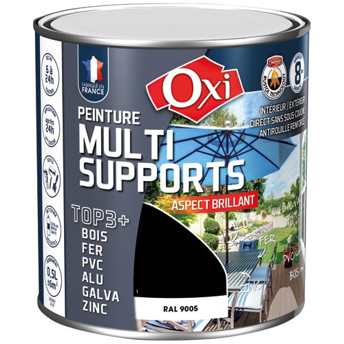 La peinture brillante multi-support TOP3 de 500 mL en coloris noir RAL9005 de la marque Oxi est destinée à la décoration et la protection de nombreux matériaux bois, fer, PVC, métaux non ferreux, intérieurs et extérieurs. TOP3+ est une formule solvantée composée de résines de qualité supérieure et renforcée grâce à la « RUSTOL Technology ». Sur BOIS, TOP3+ est microporeux et protège de l'humidité, il s'oppose, sans cloquer, au vieillissement et à la dégradation des bois neufs ou anciens : volets, menuiseries, portails, bardages… Sur fer, TOP3+ est anticorrosion, il pénètre le métal rouillé pour en chasser l’humidité, il donne une résistance exceptionnelle contre la corrosion : portails, ferronneries, tuyauteries, bardages, chaudronnerie… Pour de multiples supports, TOP3+ s’oppose à la dégradation des matériaux, permet leur rénovation et leur décoration. Ses qualités d’accrochage permettent une application sur presque tous les supports : PVC, plastiques, galva, zinc, ciment, briques, enduits… Technique mais polyvalente, la formule de TOP3+ est issue d’une formulation professionnelle éprouvée depuis plus de 20 ans dans des conditions très difficiles, sa formulation de qualité est renforcée grâce à « RUSTOL Technology » qui permet une adhérence, une pénétration et une isolation exceptionnelle de tous les supports. S’applique sur supports sains, propres, secs et dégraissés, la plupart du temps sans sous-couche. Supprimer les particules friables par grattage, ponçage ou brossage. Cette peinture s'applique généralement en 1 couche en rénovation. Pour une protection optimale, les supports non peints pourront recevoir 2 couches fines. Appliquez chaque couche de façon régulière et en croisant les passes. Outils : pinceau, rouleau laqueur ou pistolet professionnel. Sec au toucher de 8 à 12 heures, 2ème couche après 24 heures minimum. Nettoyage des outils avec le diluant Universel CR10 ou White-Spirit.