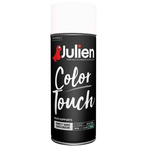 Bombe peinture blanc satiné - 400 mL de la marque JULIEN. Peinture excellence Décor de très haute qualité, exprèmement riche en résine et en pigments. Sa formule gélifiée réduit les coulures. Elle est idéale pour obtenir un fini impeccable et un résultat rapide.