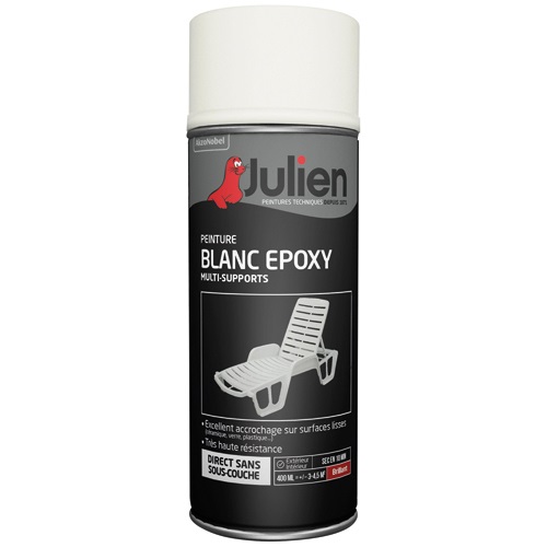 Bombe monocouche blanc epoxy n°73 - 400 mL de la marque JULIEN. Peinture excellence Décor de très haute qualité, exprèmement riche en résine et en pigments. Sa formule gélifiée réduit les coulures. Elle est idéale pour obtenir un fini impeccable et un résultat rapide.