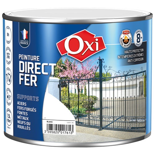 La peinture brillante Direct Fer de 250 mL en coloris blanc RAL9010 de la marque Oxi est une peinture brillante, lisse destinée à la décoration des fers neufs ou anciens même rouillés sans sous-couche. Elle s’applique aussi bien en intérieur qu’en extérieur sur fers forgés, grilles, mobiliers de jardin, objets décoratifs, luminaires, objets anciens... Excellente protection antirouille. Très bonne résistance aux chocs et aux agressions extérieures. Peinture prête à l’emploi. Bien remuer avant l'utilisation à l’aide d’une spatule large en insistant sur le fond du pot afin d’obtenir un mélange homogène. Appliquer par des températures comprises entre 10 et 25°C, sans humidité et hors courant d’air. Ne pas appliquer sur des supports surchauffés (en plein soleil) ou en cas de risque de pluie. L'humidité ambiante excessive et le manque de ventilation ralentissent le séchage de la peinture. Sur les anciennes peintures, prévoir un dépolissage au papier de verre grain 320 puis dépoussiérer. Sur les supports particulièrement rouillés, utiliser au préalable notre DESTRUCTEUR DE ROUILLE Oxi, puis utiliser notre primaire COULEUR MINIUM ANTIROUILLE Oxi. Sur les métaux non ferreux (alu, galva, zinc et cuivre), dégraisser le support puis appliquer la sous-couche SC3 GALVA PLASTIQUE Oxi.