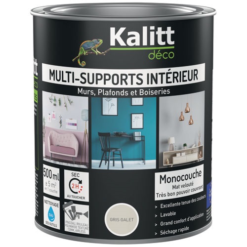 La peinture acrylique mat multi-supports de 0.5 L en coloris gris galet de la marque KALITT DECO est une peinture polyvalente monocouche pour intérieur avec un effet mat velouté, idéale pour décorer et rafraîchir votre habitat. Convient à tous les supports intérieurs tels que les enduits des groupes de mortiers P II et P III, les enduits de plâtre du groupe de mortiers P IV, les plaques de béton/fibrociment, les plaques de plâtre cartonné, les tissus de verre, les non-tissés de verre et de cellulose, le papier ingrain ainsi que les papiers peints structurés ou en papier et pour recouvrir d’anciennes couches de peinture à base de dispersion intactes. Avec son pouvoir trés couvrant le rendement est d'environ 125 mL /m² par couche sur supports lisses, légèrement absorbants. La consommation est plus élevée sur des supports rugueux. Complètement sec après environ 4 jours. Le temps de séchage est augmenté à basse température et/ou par humidité de l’air plus élevée. Conseil de préparation : Le support doit être solide, sec, propre, porteur et exempt d’efflorescence, de couches frittées, d’agents de séparation, de composants favorisant la corrosion ou d’autres couches intermédiaires qui interfèrent avec l’adhésion. Conseil de stockage : Toujours au sec et au frais, mais à l’abri du gel. Garder les contenants ouverts hermétiquement fermés.