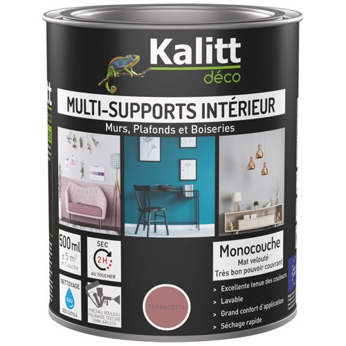 La peinture acrylique mat multi-supports de 0.5 L en coloris terracotta de la marque KALITT DECO est une peinture polyvalente monocouche pour intérieur avec un effet mat velouté, idéale pour décorer et rafraîchir votre habitat. Convient à tous les supports intérieurs tels que les enduits des groupes de mortiers P II et P III, les enduits de plâtre du groupe de mortiers P IV, les plaques de béton/fibrociment, les plaques de plâtre cartonné, les tissus de verre, les non-tissés de verre et de cellulose, le papier ingrain ainsi que les papiers peints structurés ou en papier et pour recouvrir d’anciennes couches de peinture à base de dispersion intactes. Avec son pouvoir trés couvrant le rendement est d'environ 125 mL /m² par couche sur supports lisses, légèrement absorbants. La consommation est plus élevée sur des supports rugueux. Complètement sec après environ 4 jours. Le temps de séchage est augmenté à basse température et/ou par humidité de l’air plus élevée. Conseil de préparation : Le support doit être solide, sec, propre, porteur et exempt d’efflorescence, de couches frittées, d’agents de séparation, de composants favorisant la corrosion ou d’autres couches intermédiaires qui interfèrent avec l’adhésion. Conseil de stockage : Toujours au sec et au frais, mais à l’abri du gel. Garder les contenants ouverts hermétiquement fermés.