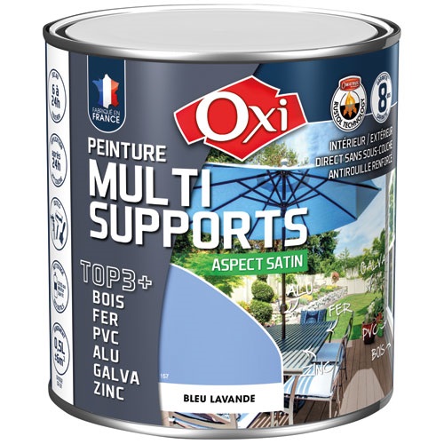 La peinture satin multi-support TOP3 de 500 mL en coloris bleu lavande de la marque Oxi est destinée à la décoration et la protection de nombreux matériaux bois, fer, PVC, métaux non ferreux, intérieurs et extérieurs. TOP3+ est une formule solvantée composée de résines de qualité supérieure et renforcée grâce à la « RUSTOL Technology ». Sur BOIS, TOP3+ est microporeux et protège de l'humidité, il s'oppose, sans cloquer, au vieillissement et à la dégradation des bois neufs ou anciens : volets, menuiseries, portails, bardages… Sur fer, TOP3+ est anticorrosion, il pénètre le métal rouillé pour en chasser l’humidité, il donne une résistance exceptionnelle contre la corrosion : portails, ferronneries, tuyauteries, bardages, chaudronnerie… Pour de multiples supports, TOP3+ s’oppose à la dégradation des matériaux, permet leur rénovation et leur décoration. Ses qualités d’accrochage permettent une application sur presque tous les supports : PVC, plastiques, galva, zinc, ciment, briques, enduits… Technique mais polyvalente, la formule de TOP3+ est issue d’une formulation professionnelle éprouvée depuis plus de 20 ans dans des conditions très difficiles, sa formulation de qualité est renforcée grâce à « RUSTOL Technology » qui permet une adhérence, une pénétration et une isolation exceptionnelle de tous les supports. S’applique sur supports sains, propres, secs et dégraissés, la plupart du temps sans sous-couche. Supprimer les particules friables par grattage, ponçage ou brossage. Cette peinture s'applique généralement en 1 couche en rénovation. Pour une protection optimale, les supports non peints pourront recevoir 2 couches fines. Appliquez chaque couche de façon régulière et en croisant les passes. Outils : pinceau, rouleau laqueur ou pistolet professionnel. Sec au toucher de 8 à 12 heures, 2ème couche après 24 heures minimum. Nettoyage des outils avec le diluant Universel CR10 ou White-Spirit.