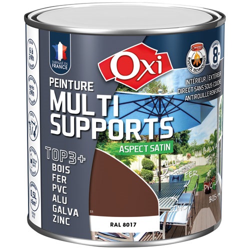 La peinture satin multi-support TOP3 de 500 mL en coloris brun RAL8017 de la marque Oxi est destinée à la décoration et la protection de nombreux matériaux bois, fer, PVC, métaux non ferreux, intérieurs et extérieurs. TOP3+ est une formule solvantée composée de résines de qualité supérieure et renforcée grâce à la « RUSTOL Technology ». Sur BOIS, TOP3+ est microporeux et protège de l'humidité, il s'oppose, sans cloquer, au vieillissement et à la dégradation des bois neufs ou anciens : volets, menuiseries, portails, bardages… Sur fer, TOP3+ est anticorrosion, il pénètre le métal rouillé pour en chasser l’humidité, il donne une résistance exceptionnelle contre la corrosion : portails, ferronneries, tuyauteries, bardages, chaudronnerie… Pour de multiples supports, TOP3+ s’oppose à la dégradation des matériaux, permet leur rénovation et leur décoration. Ses qualités d’accrochage permettent une application sur presque tous les supports : PVC, plastiques, galva, zinc, ciment, briques, enduits… Technique mais polyvalente, la formule de TOP3+ est issue d’une formulation professionnelle éprouvée depuis plus de 20 ans dans des conditions très difficiles, sa formulation de qualité est renforcée grâce à « RUSTOL Technology » qui permet une adhérence, une pénétration et une isolation exceptionnelle de tous les supports. S’applique sur supports sains, propres, secs et dégraissés, la plupart du temps sans sous-couche. Supprimer les particules friables par grattage, ponçage ou brossage. Cette peinture s'applique généralement en 1 couche en rénovation. Pour une protection optimale, les supports non peints pourront recevoir 2 couches fines. Appliquez chaque couche de façon régulière et en croisant les passes. Outils : pinceau, rouleau laqueur ou pistolet professionnel. Sec au toucher de 8 à 12 heures, 2ème couche après 24 heures minimum. Nettoyage des outils avec le diluant Universel CR10 ou White-Spirit.