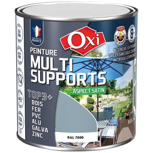 La peinture satin multi-support TOP3 de 500 mL en coloris gris foncé RAL7000 de la marque Oxi est destinée à la décoration et la protection de nombreux matériaux bois, fer, PVC, métaux non ferreux, intérieurs et extérieurs. TOP3+ est une formule solvantée composée de résines de qualité supérieure et renforcée grâce à la « RUSTOL Technology ». Sur BOIS, TOP3+ est microporeux et protège de l'humidité, il s'oppose, sans cloquer, au vieillissement et à la dégradation des bois neufs ou anciens : volets, menuiseries, portails, bardages… Sur fer, TOP3+ est anticorrosion, il pénètre le métal rouillé pour en chasser l’humidité, il donne une résistance exceptionnelle contre la corrosion : portails, ferronneries, tuyauteries, bardages, chaudronnerie… Pour de multiples supports, TOP3+ s’oppose à la dégradation des matériaux, permet leur rénovation et leur décoration. Ses qualités d’accrochage permettent une application sur presque tous les supports : PVC, plastiques, galva, zinc, ciment, briques, enduits… Technique mais polyvalente, la formule de TOP3+ est issue d’une formulation professionnelle éprouvée depuis plus de 20 ans dans des conditions très difficiles, sa formulation de qualité est renforcée grâce à « RUSTOL Technology » qui permet une adhérence, une pénétration et une isolation exceptionnelle de tous les supports. S’applique sur supports sains, propres, secs et dégraissés, la plupart du temps sans sous-couche. Supprimer les particules friables par grattage, ponçage ou brossage. Cette peinture s'applique généralement en 1 couche en rénovation. Pour une protection optimale, les supports non peints pourront recevoir 2 couches fines. Appliquez chaque couche de façon régulière et en croisant les passes. Outils : pinceau, rouleau laqueur ou pistolet professionnel. Sec au toucher de 8 à 12 heures, 2ème couche après 24 heures minimum. Nettoyage des outils avec le diluant Universel CR10 ou White-Spirit.