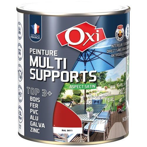La peinture satin multi-support TOP3 de 2.5 L en coloris bordeaux RAL3011 de la marque Oxi est destinée à la décoration et la protection de nombreux matériaux bois, fer, PVC, métaux non ferreux, intérieurs et extérieurs. TOP3+ est une formule solvantée composée de résines de qualité supérieure et renforcée grâce à la « RUSTOL Technology ». Sur BOIS, TOP3+ est microporeux et protège de l'humidité, il s'oppose, sans cloquer, au vieillissement et à la dégradation des bois neufs ou anciens : volets, menuiseries, portails, bardages… Sur FERS, TOP3+ est anticorrosion, il pénètre le métal rouillé pour en chasser l’humidité, il donne une résistance exceptionnelle contre la corrosion : portails, ferronneries, tuyauteries, bardages, chaudronnerie… Pour de multiples supports, TOP3+ s’oppose à la dégradation des matériaux, permet leur rénovation et leur décoration. Ses qualités d’accrochage permettent une application sur presque tous les supports : PVC, plastiques, galva, zinc, ciment, briques, enduits… Technique mais polyvalente, la formule de TOP3+ est issue d’une formulation professionnelle éprouvée depuis plus de 20 ans dans des conditions très difficiles, sa formulation de qualité est renforcée grâce à « RUSTOL Technology » qui permet une adhérence, une pénétration et une isolation exceptionnelle de tous les supports. Application S’applique sur supports sains, propres, secs et dégraissés, la plupart du temps sans sous-couche. Supprimer les particules friables par grattage, ponçage ou brossage. Cette peinture s'applique généralement en 1 couche en rénovation. Pour une protection optimale, les supports non peints pourront recevoir 2 couches fines. Appliquer chaque couche de façon régulière et en croisant les passes. Outils : pinceau, rouleau laqueur ou pistolet professionnel. Séchage : sec au toucher : 8 à 12 heures, 2ème couche : 24 heures minimum. Nettoyage des outils : diluant Universel CR10 ou White-Spirit