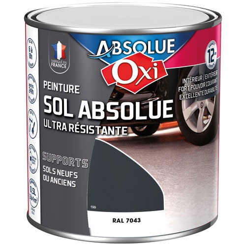 La peinture veloutée Sol Absolue de 500 mL en coloris gris carbone RAL7043 de la marque Oxi est spécialement formulée pour résister aux agressions et aux contraintes des sols neufs ou anciens. Très opacifiante, elle masque les imperfections du sol en surface. Son fort pouvoir couvrant permet d'obtenir un revêtement lisse et tendu. Idéale pour la rénovation et le traitement antipoussière des garages, des sous-sols, escaliers, balcons et terrasses. La peinture SOL ABSOLUE s'applique en intérieur et en extérieur sur ciment, béton, pierre, goudron et parquets en bois. Microporeuse, elle laisse le support respirer, ce qui évite les cloquages.