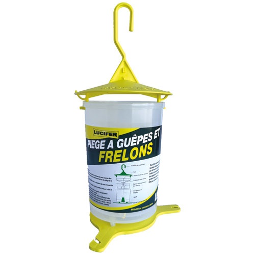 Piège a guêpes et frelons asiatique de la marque LUCIFER. Plastique résistant au gel et soleil. 2 entrées au dessus et sous le piège. Pas de contact entre l appât et les insectes grâce au panier récupérateur. Médaillé au concours Lépine. Dimension : H: 38 cm Diam: 18 cm .