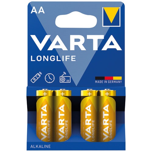La pile alcaline Longlife AA / LR06 lot de 4 de chez Varta est une pile équilibrée pour tous les jours et tous les budgets. Flexibilité pour le long terme. Préservez votre liberté chaque jour avec Varta Longlife, nos piles longue durée faites pour les appareils ayant un besoin d'énergie faible mais pour un fonctionnement continu, tels que les télécommandes, les horloges murales ou les radios. Elles se caractérisent par de longues durées de fonctionnement et une alimentation fiable en énergie, afin que vous restiez indépendant à chaque seconde. L'essentiel : longue durée de vie et bonnes performances, notamment dans les appareils nécessitant une énergie constante et faible, tels que les télécommandes, les horloges murales, les radios ou les balances numériques. Reconnaissance facile et intelligente de l'utilisation recommandée par des icônes modernes. "Made in Germany - fait pour durer", la qualité de la marque Varta assurée. 10 ans de puissance garantie en stockage. Solution d'emballage intelligente et pratique : Mécanisme d'ouverture/fermeture innovant pour un rangement simple des piles usagées ou inutilisées. Nouvelle conception innovante de la cellule et finition mate unique de l'étiquette pour une apparence haptique de qualité. Détails : dimensions AA, référence CEI LR6, diamètre 14.5 millimètres, hauteur 50.5 millimètres, poids 23.2 gr, système chimique alcaline standard à base de manganèse, tension 1.5 V.