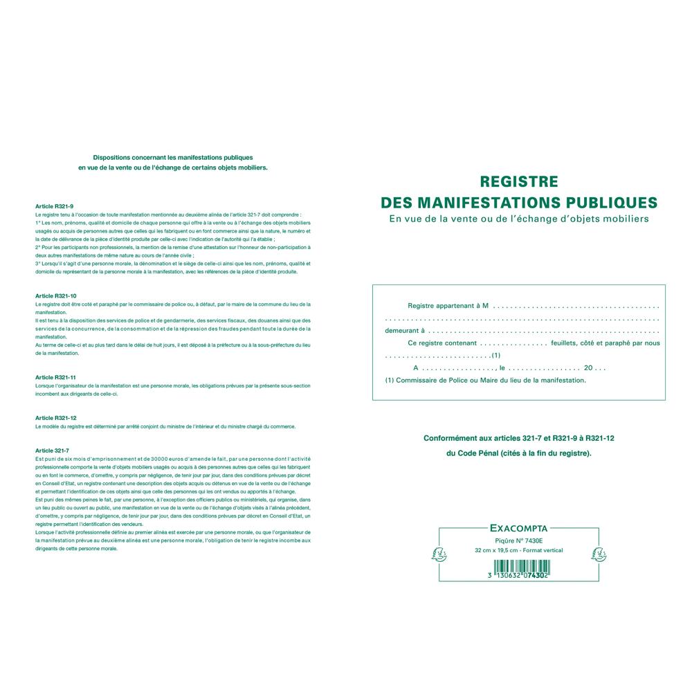 Tout organisateur d'une vente au déballage (brocantes, vide-greniers... ) est tenu d'établir un registre des vendeurs. Le registre Exacompta permet ainsi très facilement de noter toutes les mentions légales et obligatoires : nom et prénom des particpants ou nom de ma personne morale, qualité et domicile, numéro d'immatriculation pour les commerçants nature, numéro et date de la pièce d'identité pour les personnes physiques.
