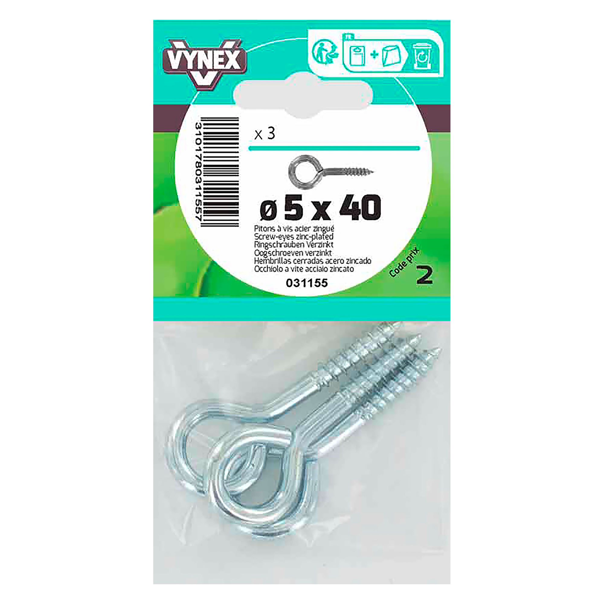 Piton à vis Vynex Ø 5 x L 40 mm en acier zingué. Idéal pour suspendre des objets ou maintenir des ouvrants de menuiserie. Installation rapide sur bois ou maçonnerie avec cheville adaptée. Résistant à la corrosion, adapté à un usage intérieur ou extérieur. Sachet de 3 pitons.