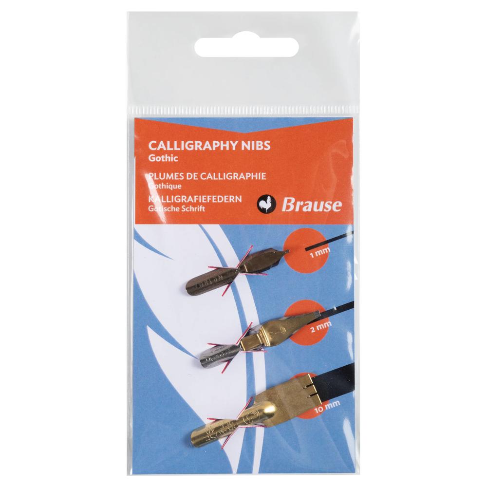 Ce set de 3 plumes est l'indispensable pour débuter et s'entrainer à réaliser de la Gothique. L'acuité des angles de la Bandzug (1 & 2,5 mm) donne une grande précision à ses déliés tandis que la plume Plakat (10mm), est idéale pour tracer des lettres de grande largeur. Brause est le spécialiste depuis 1850 des plumes de calligraphie, de dessin et d'écriture. Fabrication allemande.