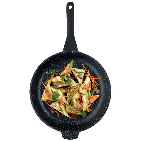 Poêle 32 cm + contre-poignée - Stella Nova - Une gamme d'ustensiles de cuisson au design attrayant permettant une cuisine saine et croustillante - En fonte d'aluminium avec revêtement anti-adhésif renforcé 3 couches résistant aux rayures et qui permet de cuire avec une petite quantité de matière grasse - Répartition homogène des matières grasses grâce au Oil Control System : la texture non lisse du revêtement permet de griller les aliments en utilisant très peu de matière grasse - Les aliments ne brûlent pas et ne collent pas - Fond épais en inox permettant de faire des économies d'énergie tout en répartissant uniformément la chaleur - Poignée en bakélite stable et ergonomique avec revêtement Soft Touch - Diamètre 32 cm - Hauteur 6.5 cm - Coloris Noir - Tous feux dont induction - Garantie 5 ans.