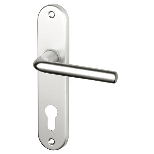 La poignée de porte extérieur Courchevel sur plaque entraxe 165 mm clé cylindre alu argent de chez Alpertec est une garniture sur plaque. L'ensemble de 2 poignées de porte extérieure, design en aluminium anodisé argent, fonction clé I pour cylindre de serrure de porte d'entrée. Poignée de porte sans ressort de rappel compatible avec les serrures à relevage. Matière de la plaque : Aluminium. Matière de la poignée : Aluminium. Finition de la plaque : Argent. Finition de la poignée : Argent. Accessoires fournis : 2 vis relieuses 4 x 45 mm. 1 carré de 7 x 95 mm. Entraxe fixation (mm) : 165. Entraxe Béquille/ trou de perçage (mm) : 70. Largeur plaque (mm) : 39. Hauteur plaque (mm) : 185. Saillie de la béquille (mm) : 53. Ressort de rappel : Non. Epaisseur de porte (mm) : 36 à 44.