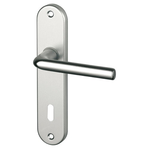 La poignée de porte intérieur Courchevel sur plaque entraxe 165 mm clé en L alu argent de chez Alpertec est un ensemble de 2 poignées de porte intérieure, design en aluminium anodisé argent, fonction Clé L de confidentialité pour chambre à coucher. Matière de la plaque : Aluminium.