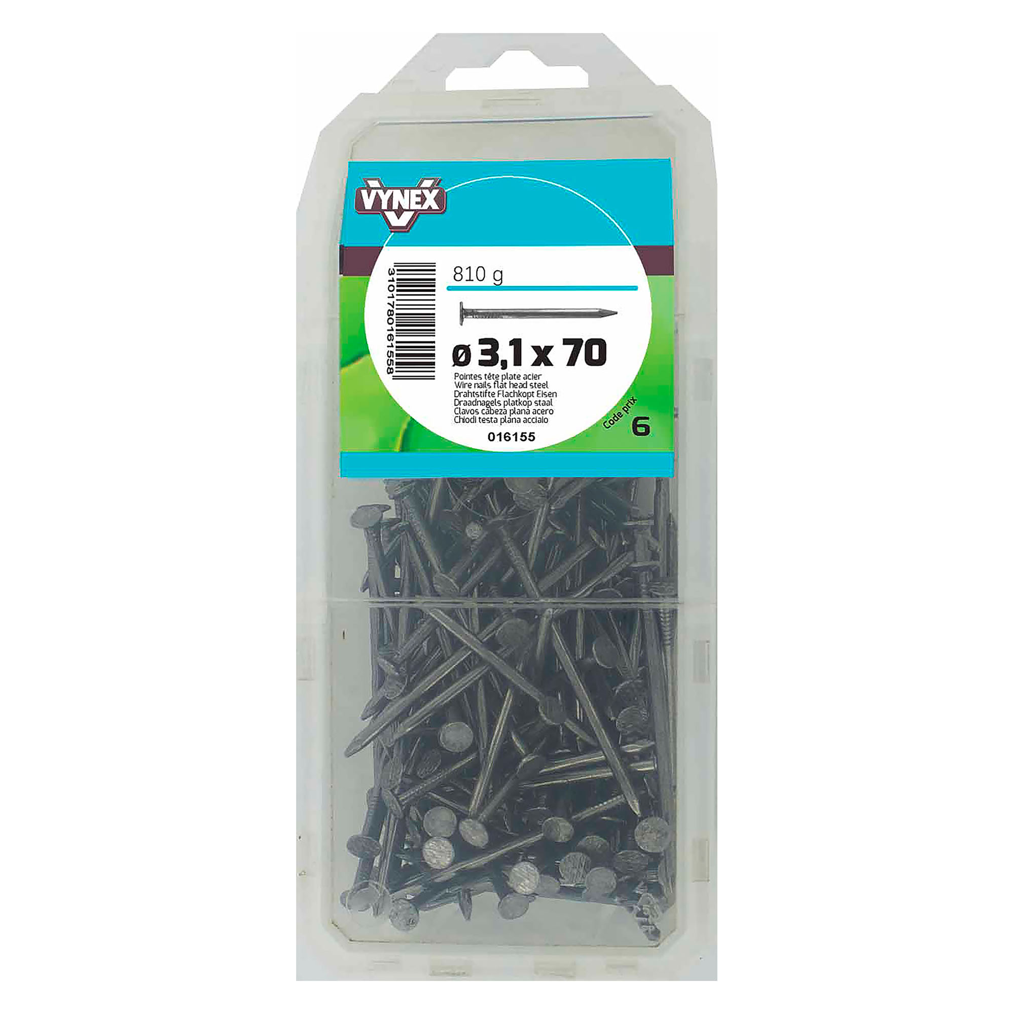 Clous à tête plate Ø 3,1 x L 70 mm, parfaits pour vos travaux de menuiserie. Assurent une fixation solide bois sur bois ou contreplaqué sur bois. Tête plate idéale pour un arrache-clou, pratique en cas de démontage. Finition soignée pour un rendu propre sur cadres, parquets ou lambris. Paquet de 810 clous.