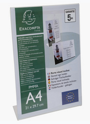 Le porte-visuel incliné vertical Exacompta est idéal pour afficher vos photos ou documents sur une table, bureau ou étagère. Son inclinaison permet une visibilité optimale de votre support. Fabriqué en PMMA (acrylique) de haute qualité avec une très haute transparence, il met en valeur votre visuel. Il est utilisable aussi bien verticalement qu'horizontalement grâce à sa base biseauté Fabriqué en Europe, il est garanti 5 ans et est résistant aux UV, il ne jaunit pas Vous pouvez facilement créer vos supports personnalisés et à la bonne taille avec KREAMAN sur www.exacompta.com