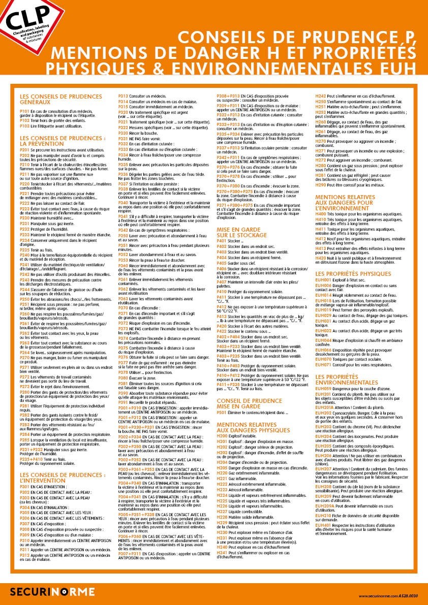 Améliorez la sécurité sur votre lieu de travail avec notre poster CPL, spécifiquement conçu pour les zones de stockage et de passage. Ce poster détaille les Conseils de Prudence P, les Mentions de Danger H et les Propriétés Physiques et Environnementales EUH, offrant une identification claire des risques associés aux produits chimiques.