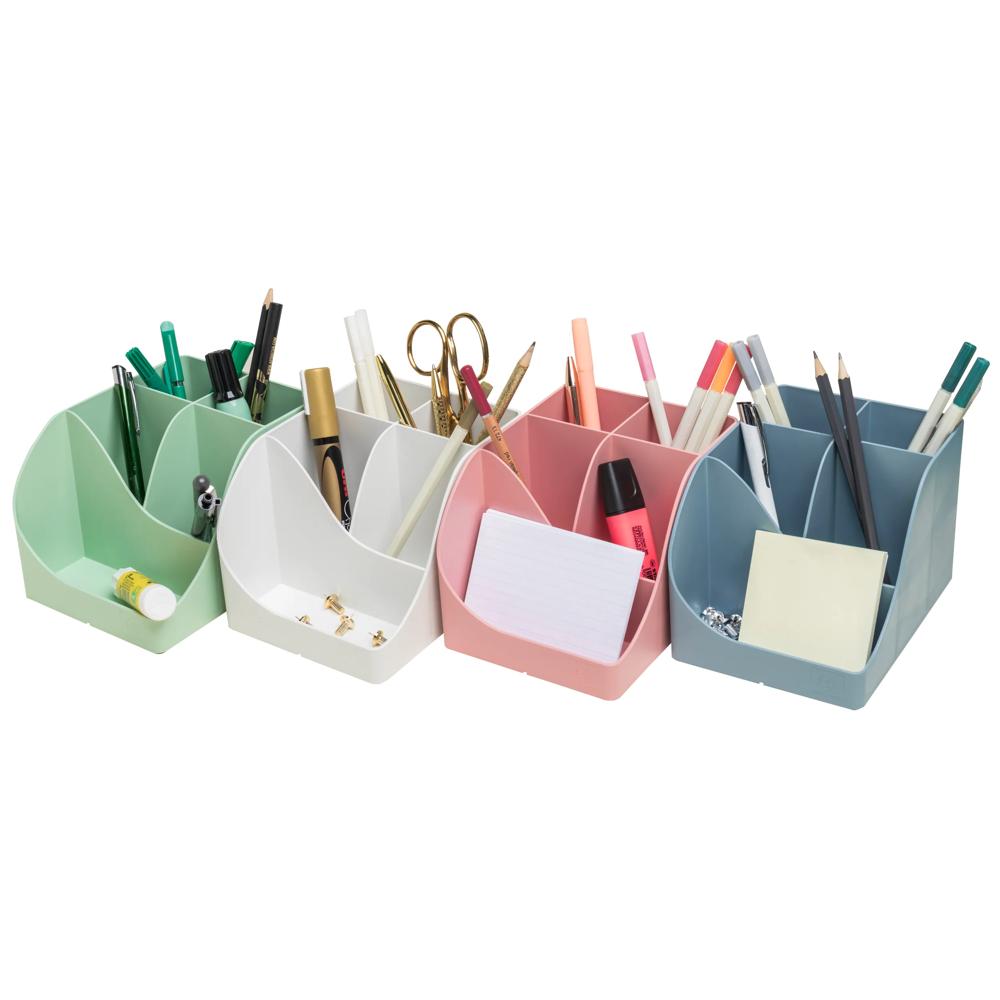 Le top du design associé au top de l'éco-responsabilité avec un plastique blanc issu de déchets. Autentik c'est donc des produits qui redonnent vie aux plastiques usagés. Une innovation Exacompta. Cette gamme aux influences scandinaves et aux couleurs blanc, rose Candy, sauge et bleu gris saura se fondre dans les intérieurs comme dans les bureaux. Le Pen Wave est un pot à crayon solide et stable à grande capacité. Grâce à ses 5 compartiments de hauteurs différentes, il offre une grande capacité de rangement : 4 compartiments hauts pour les grands ustensiles , ciseaux, stylos et 1 compartiment bas pour les petits objets tels que les trombones, les punaises, clé USB ou même pur poser son téléphone portable. Ce pot à crayons design et très pratique sera des plus adaptés à votre espace de travail au bureau comme à la maison. Respectueux de l'environnement, ce pot à crayons est fabriqué en plastique recyclé issu des déchets ménagers et est ainsi certifié Ange Bleu. Garantie 25 ans.