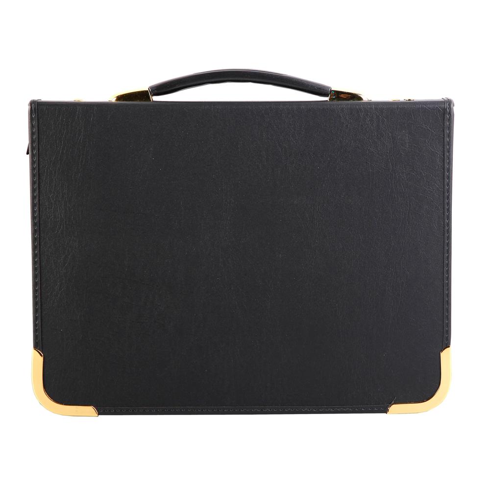 Lot de 3 pressbook noirs élégants avec couverture rigide en vinyl grainé. Ultra-résistant avec fermeture éclair et renforts métalliques dorés dans les coins. Pratique grâce à sa pochette élastique intérieure et ses anneaux solides intégrés. Idéal pour présenter et protéger les oeuvres d'un artiste. Livré sans pochettes plastiques.