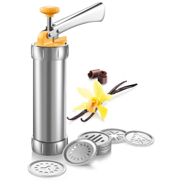 Presse à biscuits - Delicia - Réalisez 20 formes différentes de biscuits ! - En inox de qualité supérieure et en aluminium - Kit presse à biscuit comprenant 20 disques à motifs + 4 douilles - Réalisez rapidement des biscuits salés ou sucrés, selon vos goûts, en un éclair ! - Réglage de la dose de pâte dispensée - Facile d'utilisation : appuyez sur la poignée d'une légère pression pour réaliser chacun de vos biscuits - Entièrement démontable - GARANTIE 3 ANS.