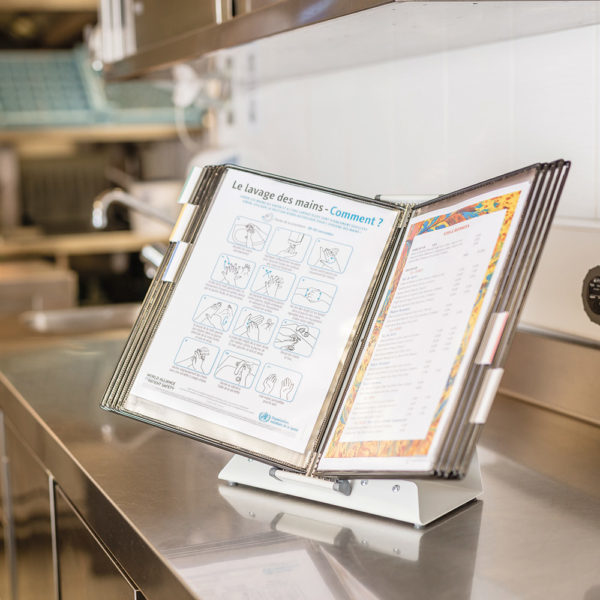 Optimisez l'organisation de vos documents dans les environnements à haut risque de contamination microbienne avec ce pupitre de consultation Tarifold antimicrobien. Conçu pour répondre aux exigences des secteurs médical, paramédical, pharmaceutique et de la restauration, ce pupitre met en avant une technologie avancée pour garantir une hygiène optimale.