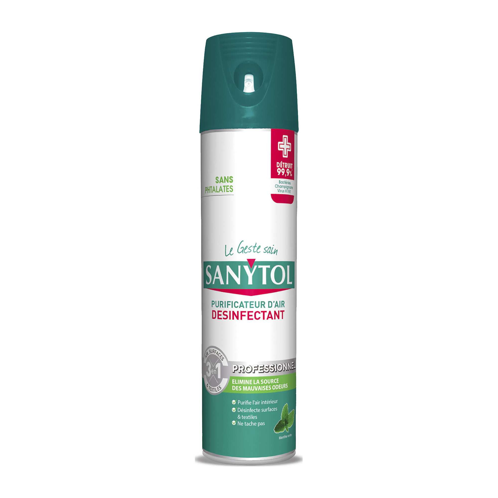 Le purificateur d'air désinfectant surfaces & textiles Sanytol Professionnel purifie et parfume l’air d’une fraicheur menthe verte et désinfecte les surfaces.