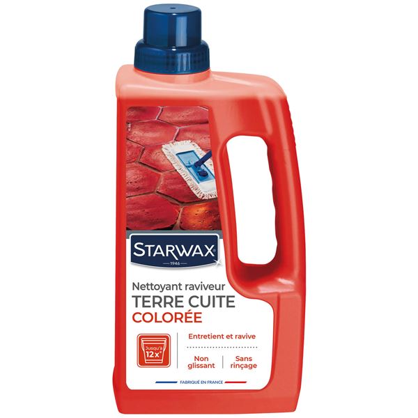 Le nettoyant raviveur spécial tomettes terre cuite colorée de 1 L de la marque STARWAX nettoie, entretien et ravive la teinte des sols rouges ou flammés en une seule opération. Convient sur tomettes, terres cuites, brique colorées. Non glissant. Sans rinçage.