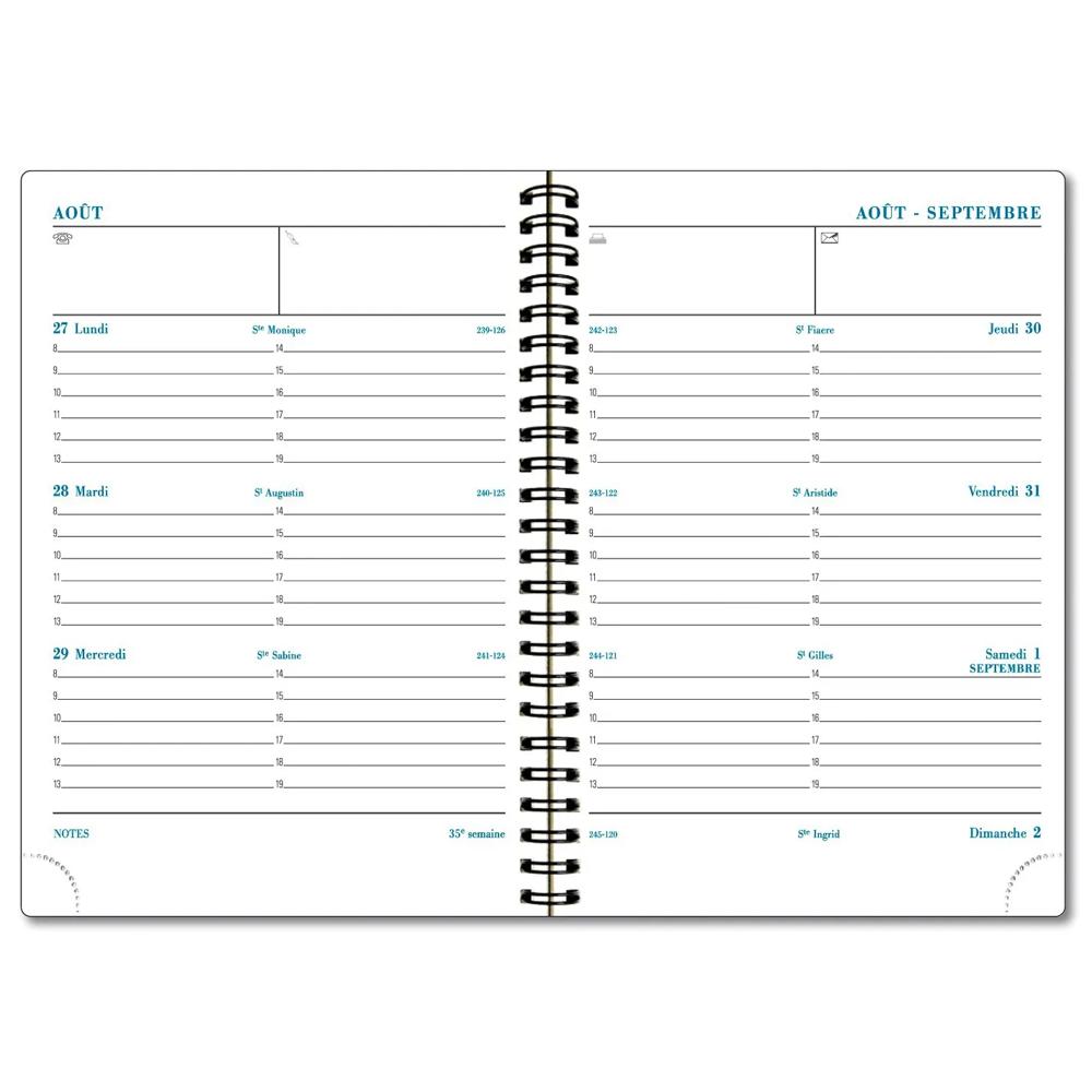 La recharge de votre agenda est fabriquée en France dans nos usines parisiennes. Elle est conçue dans une démarche environnementale d'amélioration continue, par des amoureux du papier depuis plus de 90 ans. Organisez votre semaine en toute simplicité avec une vue d'ensemble sur deux pages au format horizontal, couvrant une plage horaire de 8h à 19h du lundi au samedi. Un espace réservé aux notes est disponible pour le dimanche en bas à droite, ainsi qu'une zone de prise de notes en bas à gauche. En haut de chaque page, profitez d'un espace pour noter les numéros de téléphone, adresses e-mails importants et les priorités de la semaine. Cette édition française est conçue avec une spirale intérieure pour une ouverture à plat, offrant un confort d?utilisation optimal. Les + : impression en bleu et gris sur papier blanc Clairefontaine, reconnu pour sa qualité et pour permettre une écriture douce et fluide - coins détachables, pour pouvoir accéder rapidement au jour en cours - indication du numéro de semaine pour se repérer plus facilement - chaque jour, mention des Saints pour ne pas oublier les fêtes à souhaiter. Pages spécifiques : vacances scolaires - un planning de l'année en cours et celui de l'année suivante - les fêtes à souhaiter. Certifications : PEFC (fibres de papier issues de forêts gérées durablement) - Imprim'vert (impression respectueuse de l'environnement). Né dans les Vosges. Fabriqué en France et pensé pour vous !