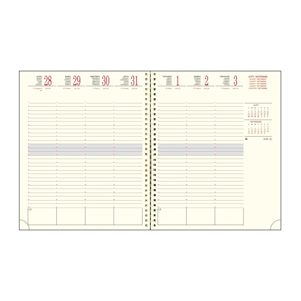 La recharge de votre agenda est fabriquée en France dans nos usines parisiennes. Elle est conçue dans une démarche environnementale d'amélioration continue, par des amoureux du papier depuis plus de 90 ans. Profitez d'une vue hebdomadaire claire grâce à une disposition verticale sur deux pages, offrant un aperçu complet de la semaine en un coup d'?il. Une large plage horaire étendue du lundi au dimanche de 7h à 21h . Retrouvez également des mini-calendriers du mois en cours ainsi que du mois suivant et un espace de notes à droite. Édition en français, avec une reliure spiralée pour une ouverture à plat facile. Les + : impression en rouge et gris sur papier ivoire Clairefontaine, reconnu pour sa qualité et pour permettre une écriture douce et fluide - coins détachables , pour pouvoir accéder rapidement au jour en cours - indication du numéro de semaine pour se repérer plus facilement. Pages spécifiques : vacances scolaires - un planning de l'année en cours et celui de l'année suivante - les fêtes à souhaiter Certifications : PEFC (fibres de papier issues de forêts gérées durablement) - Imprim'vert (impression respectueuse de l'environnement). Né dans les Vosges. Fabriqué en France et pensé pour vous !
