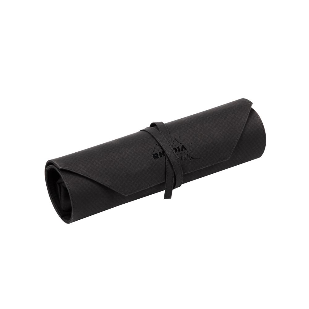 Toile noire imprimée, logo Rhodia Touch embossé. Format ouvert : 45 x 30 cm. Poche à outils compartimentée avec rabat de protection. Contient une trousse amovible (attaches velcros). Format 30 x 8 cm. Fermeture par lanière. Filmé individuellement
