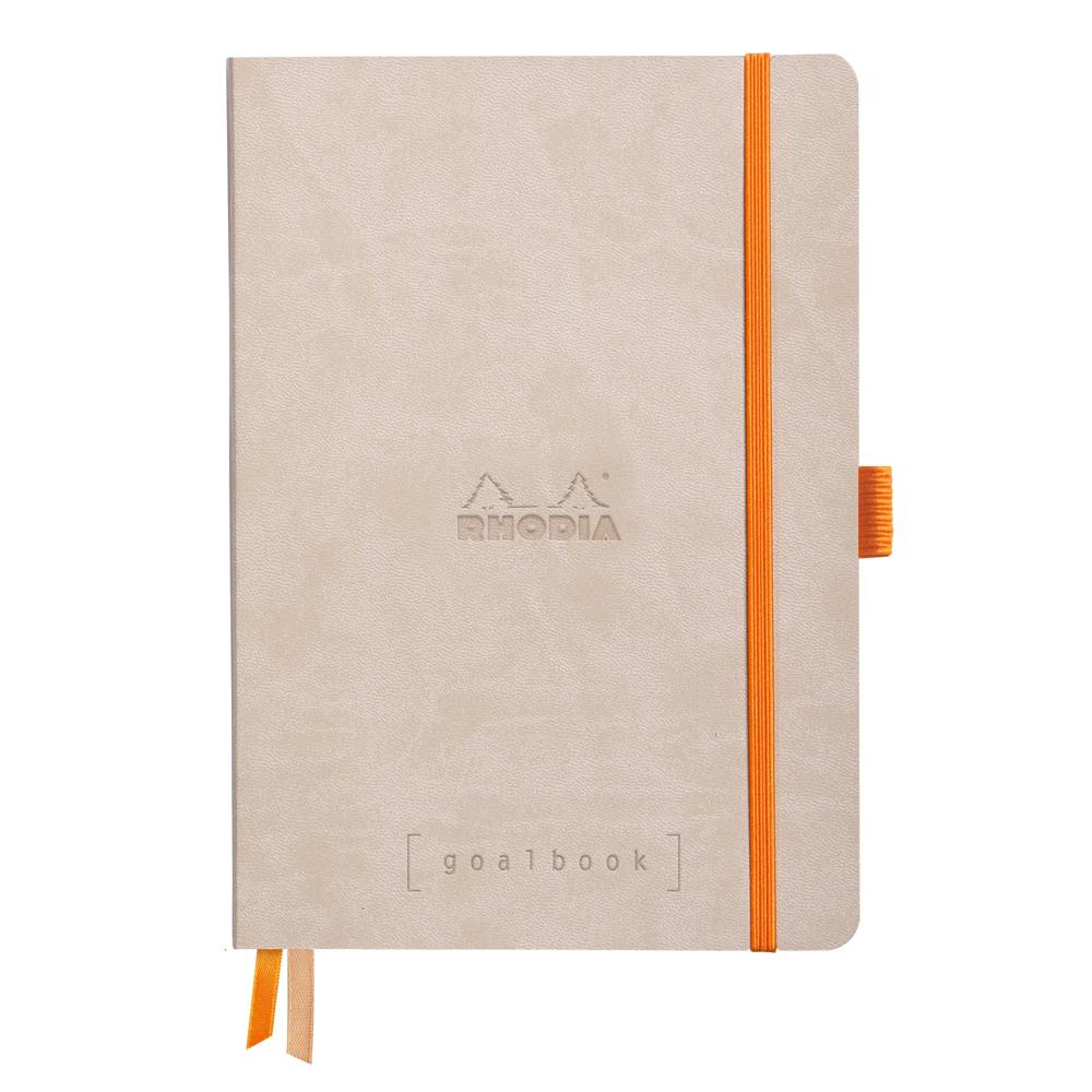 Rhodia Goalbook A5 softcover 240 pages numérotées DOT papier ivoire Le Goalbook est l'outil idéal pour le Bullet Journaling© afin d'organiser son quotidien et ne rien oublier. Ultra-personnalisable grâce à ses 240 pages non perforées dont 224 pages numérotées, 6 pages d'index et 2 calendriers perpétuels. Brochure souple dos carré collé, fermeture à élastique, couverture souple simili cuir italien, logo Rhodia embossé. Deux rubans marq ue-pages et pochette à soufflet. Filmé individuellement.
