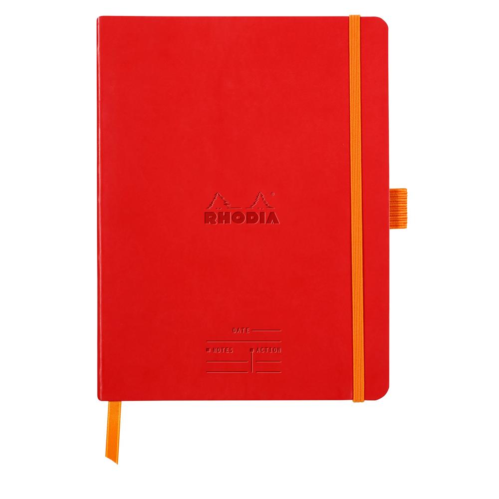 Couverture souple en simili cuir italien, dos carré collé, logos embossés, fermeture élastique orange, 160 pages microperforées, papier vélin velouté blanc 90 g, calendrier perpétuel, porte-crayon, ruban marque-page, pochette à soufflets et pages de garde orange