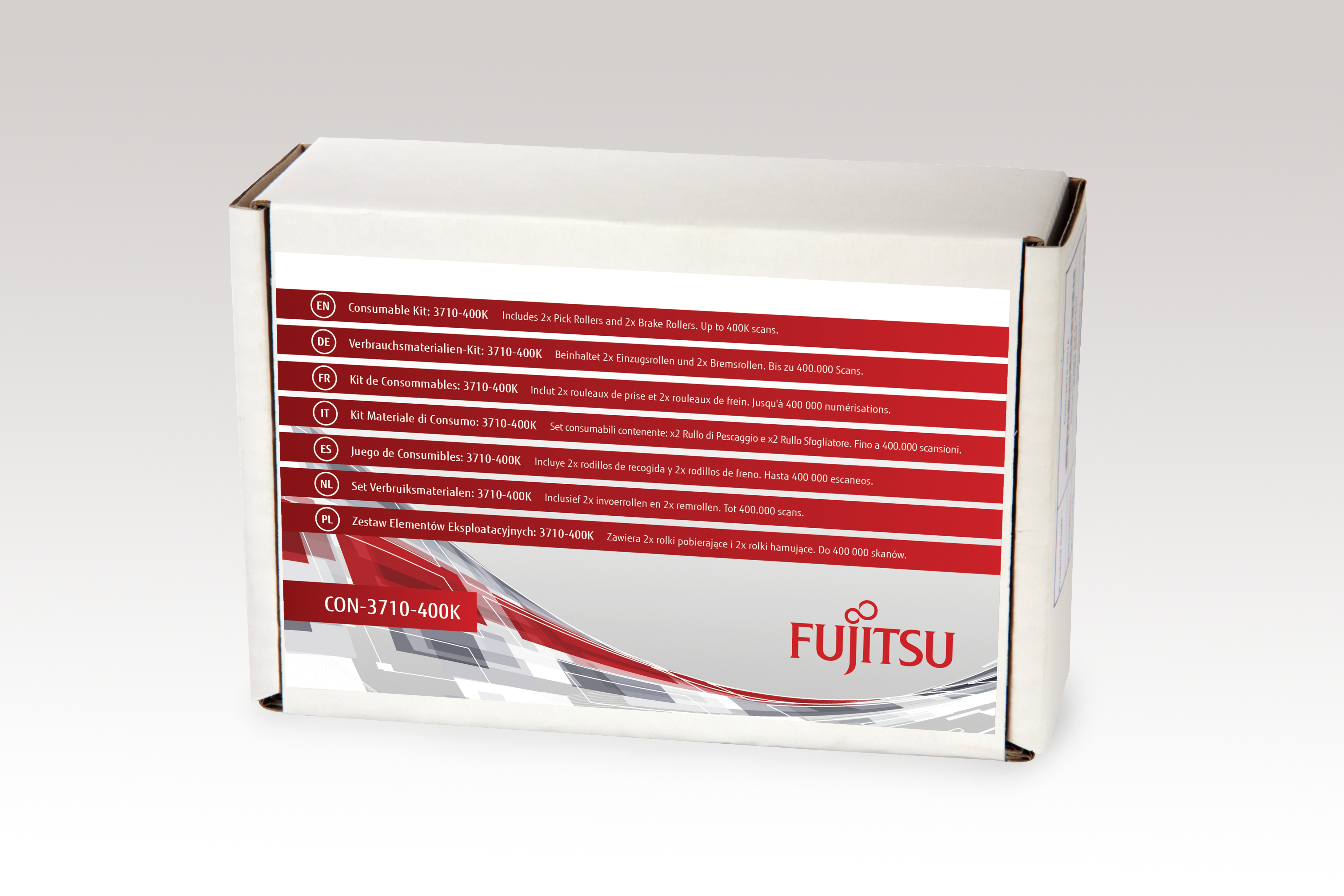 Ce kit de consommables agréé par le fabricant contient les instructions et les consommables appropriés. Vous pouvez vous le procurer auprès de votre revendeur. Le kit contient des pièces de rechange pour les éléments qui s'usent naturellement dans les conditions normales d'utilisation, comme les patins et les rouleaux. Il s'agit d'un kit de maintenance préventive indispensable qui permet d'améliorer les performances, de réduire les coûts de réparation et de conserver votre scanner en parfait état de marche.