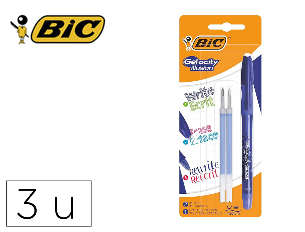 Le set comprend 3 unités du Roller BIC Gel-Ocity Illusion, tous rechargeables et munis d'encre effaçable bleue.