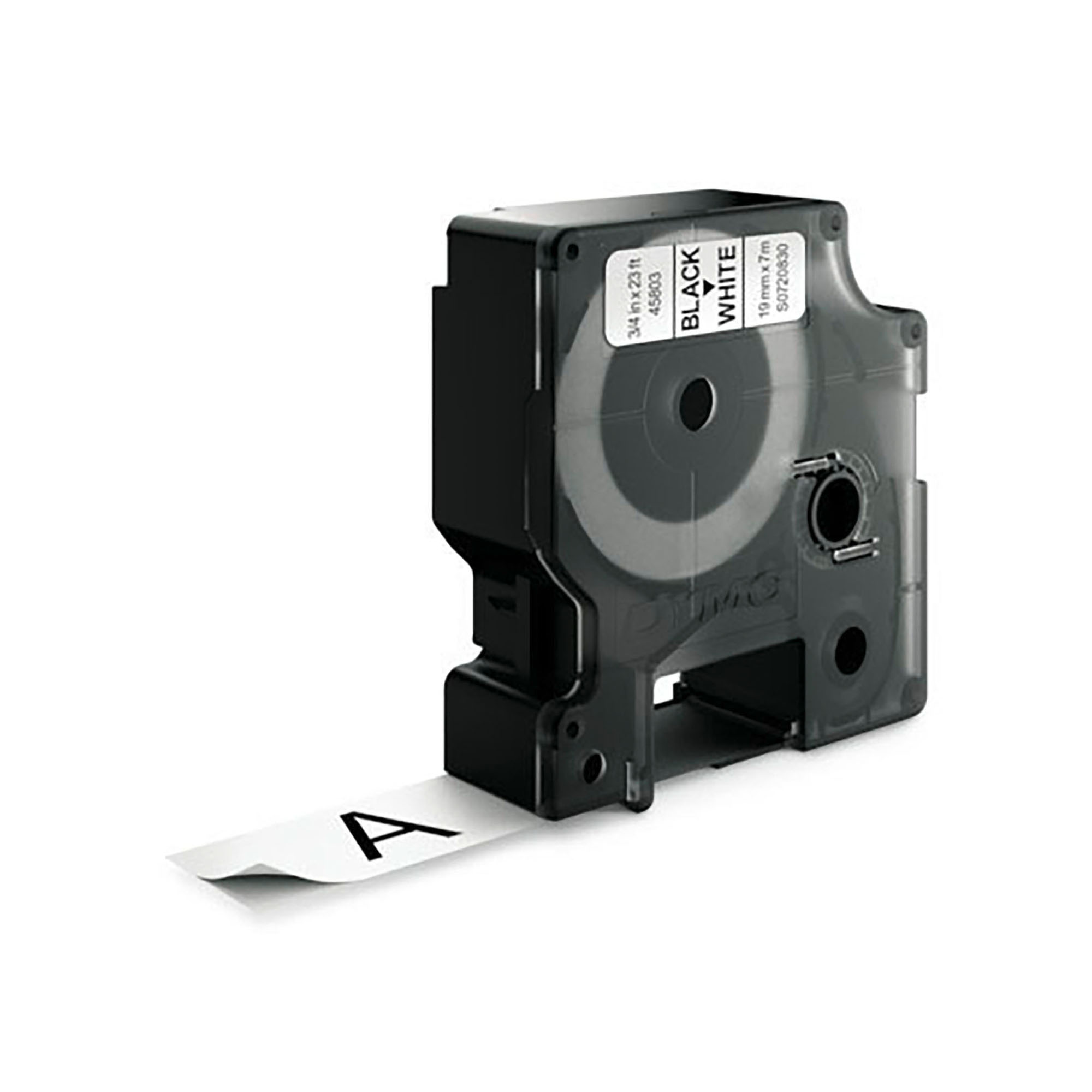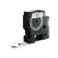 Ruban étiqueteuse Dymo. Longueur 7 m, fond blanc écriture noire.