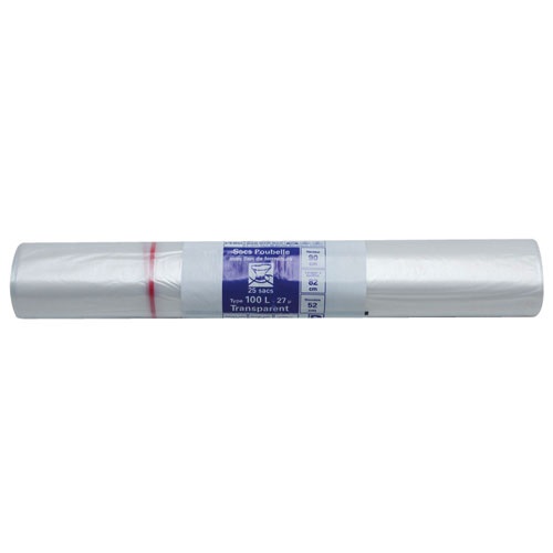 Lot de 25 sacs poubelle PUBLI EMBAL Expert avec PEBD, soudure à plat. Capacité : 100 L. Dimensions : 82x90 cm. Epaisseur : 27 microns. Coloris : transparent.