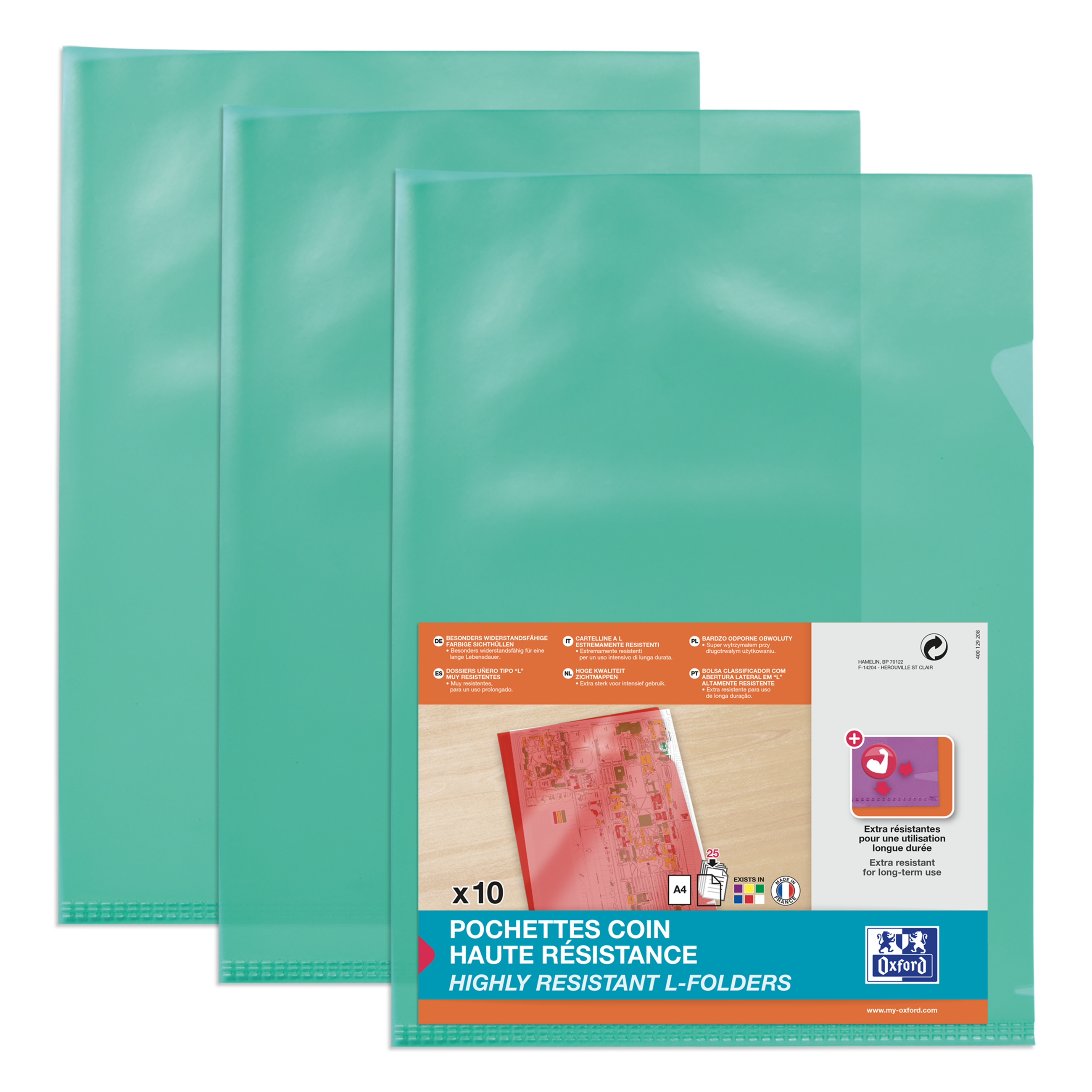 TRANSPARENCE : Le PVC translucide de la pochette-coin permet une identification immédiate du contenu et une meilleure lisibilité des documents. CAPACITE : La pochette-coin transparente Haute Résistance dispose d'une bonne capacité de rangement puisqu'elle peut contenir 25 feuilles de format A4, en moyenne. OUVERTURE : Pour faciliter l'ouverture, une découpe "coup de pouce" est située sur la pochette translucide. Elle permet d'accéder facilement au contenu et offre une ouverture rapide de la pochette-coin. Ce produit est disponible sous les versions de couleurs suivantes : - Vert
