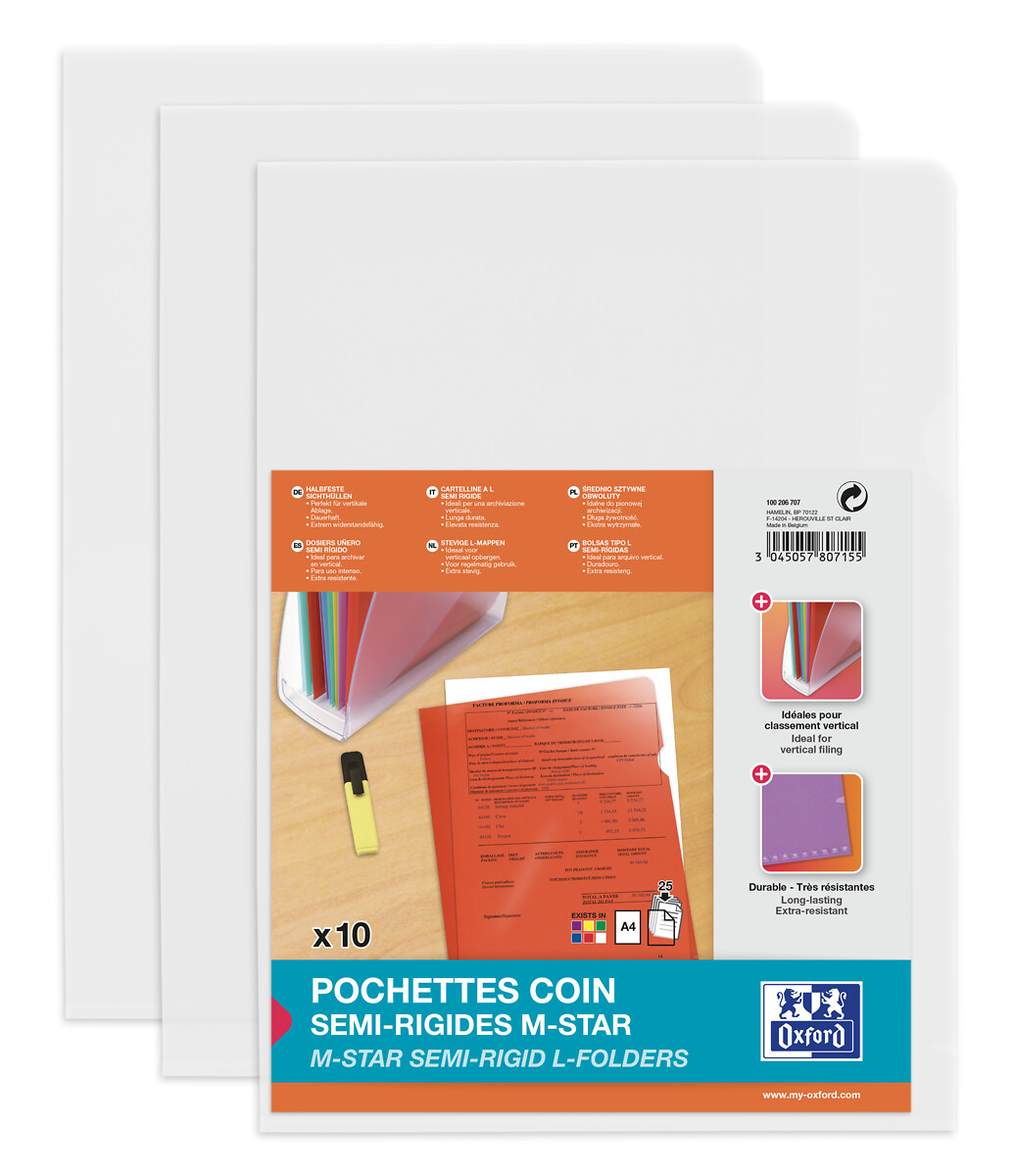 TRANSPARENCE : Le PVC translucide de la pochette-coin permet une identification immédiate du contenu et une meilleure lisibilité des documents. CAPACITE : La pochette-coin transparente M Star dispose d'une bonne capacité de rangement puisqu'elle peut contenir 25 feuilles de format A4, en moyenne. OUVERTURE : Pour faciliter l'ouverture, une découpe "coup de pouce" est située sur la pochette translucide. Elle permet d'accéder facilement au contenu et offre une ouverture rapide de la pochette-coin. Ce produit est disponible sous les versions de couleurs suivantes : - Assorti : Bleu ; Jaune ; Rouge ; Vert ; Violet - Bleu - Incolore - Jaune - Rouge - Vert - Violet