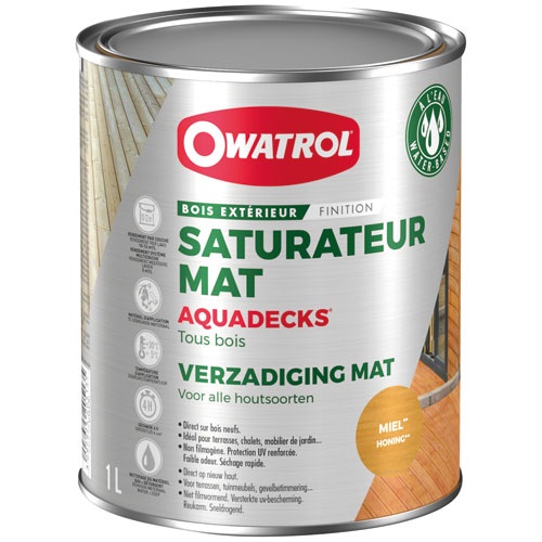 Le Saturateur Aquadecks tous bois à l'eau intérieur et extérieur de coloris miel de 1 L de la marque OWATROL protège et conserve l'aspect naturel du bois. Rendement par couche : 10 à 12 m²/L. Coloris : Miel. Prêt à l'emploi. S'applique sur toutes surfaces verticales (bardages, chalets) et horizontales (terrasses, caillebotis, mobilier de jardin). Compatible sur tous bois neufs ou anciens, exempts de tout revêtements, y compris western red cedar. Application facile. Séchage rapide en 4h. Protection UV renforcée permettant une longue tenue. Ne s'écaille pas.