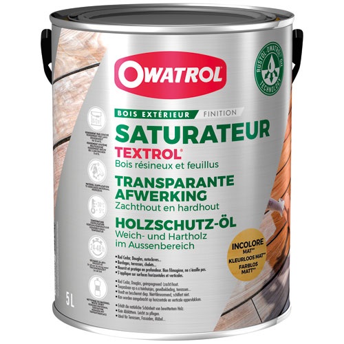 Le saturateur pour bois tendres à base d’huiles naturelles végétales Textrol de 5 L dela marque OWATROL pour tous vos travaux sur bois extérieur, sur des surfaces horizontales et verticales. Il pénètre, isole et protège le bois de vos bargages, volets, barrières ou terrasses. Pour 10 à 12 m²/L Teinte : incolore A utiliser uniquement sur des bois extérieurs tendres (red cedar, douglas, mélèze, pin traités à coeur ou non, frêne). Ne pas utiliser sur du bois neufs. Il faut appliquer le saturateur en deux couches à l'aide d'une brosse, d'un pinceau ou d'un pistolet. Il ne faut pas laisser sécher entre les deux couches, il faut appliquer humide sur humide. Une fois le bois saturé, il faut brosser ou essuyer le produit en excès. Séchage en 24 à 48h. Nettoyage des outils au White-Spirit. Ne s'écaille pas. Ne pèle pas car non filmogène. Protection contre les moisissures. Application facile et rapide.